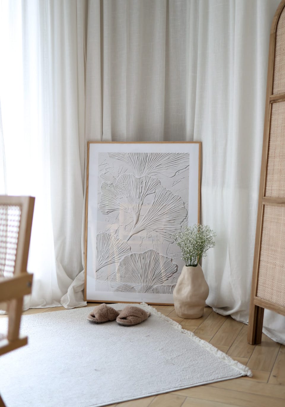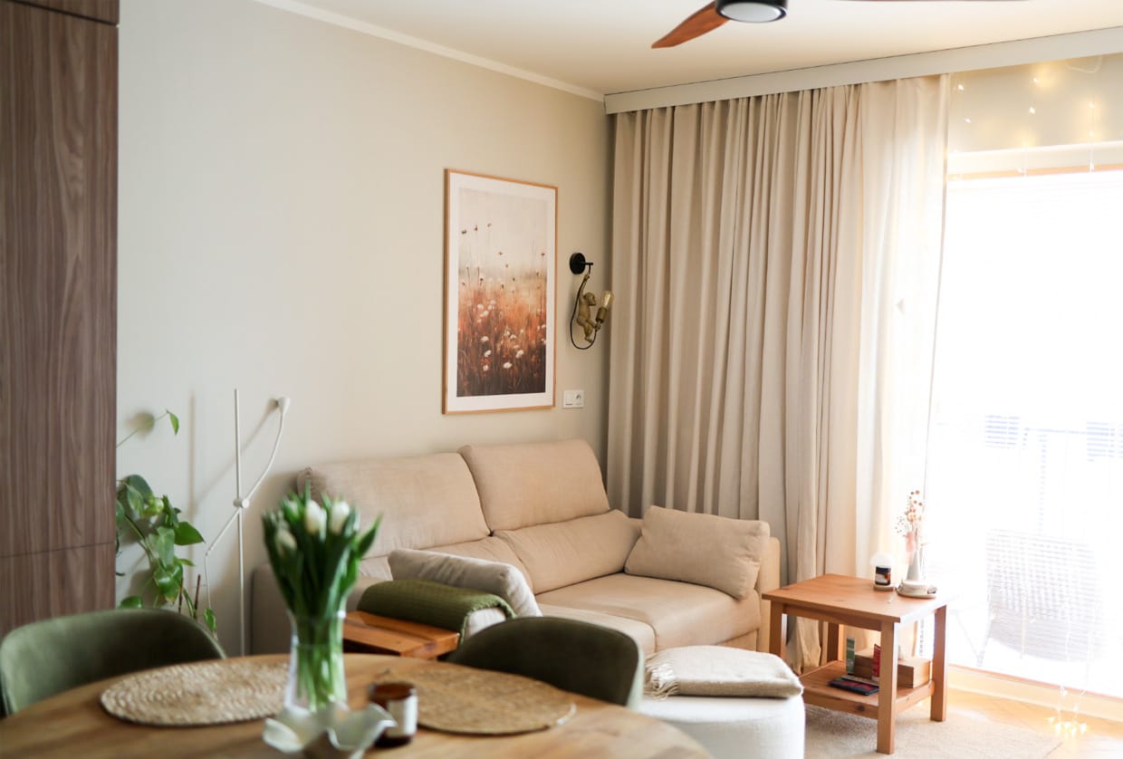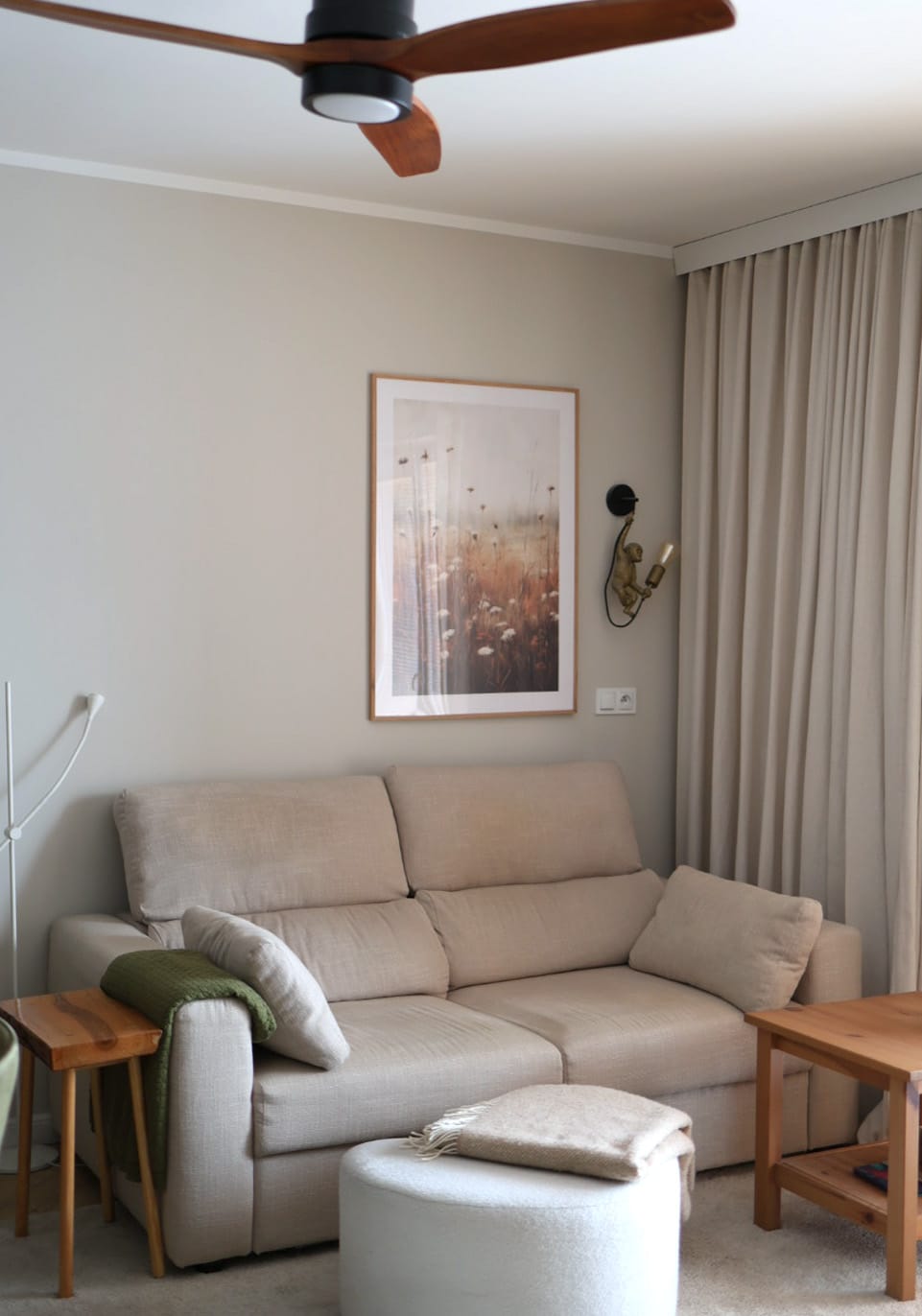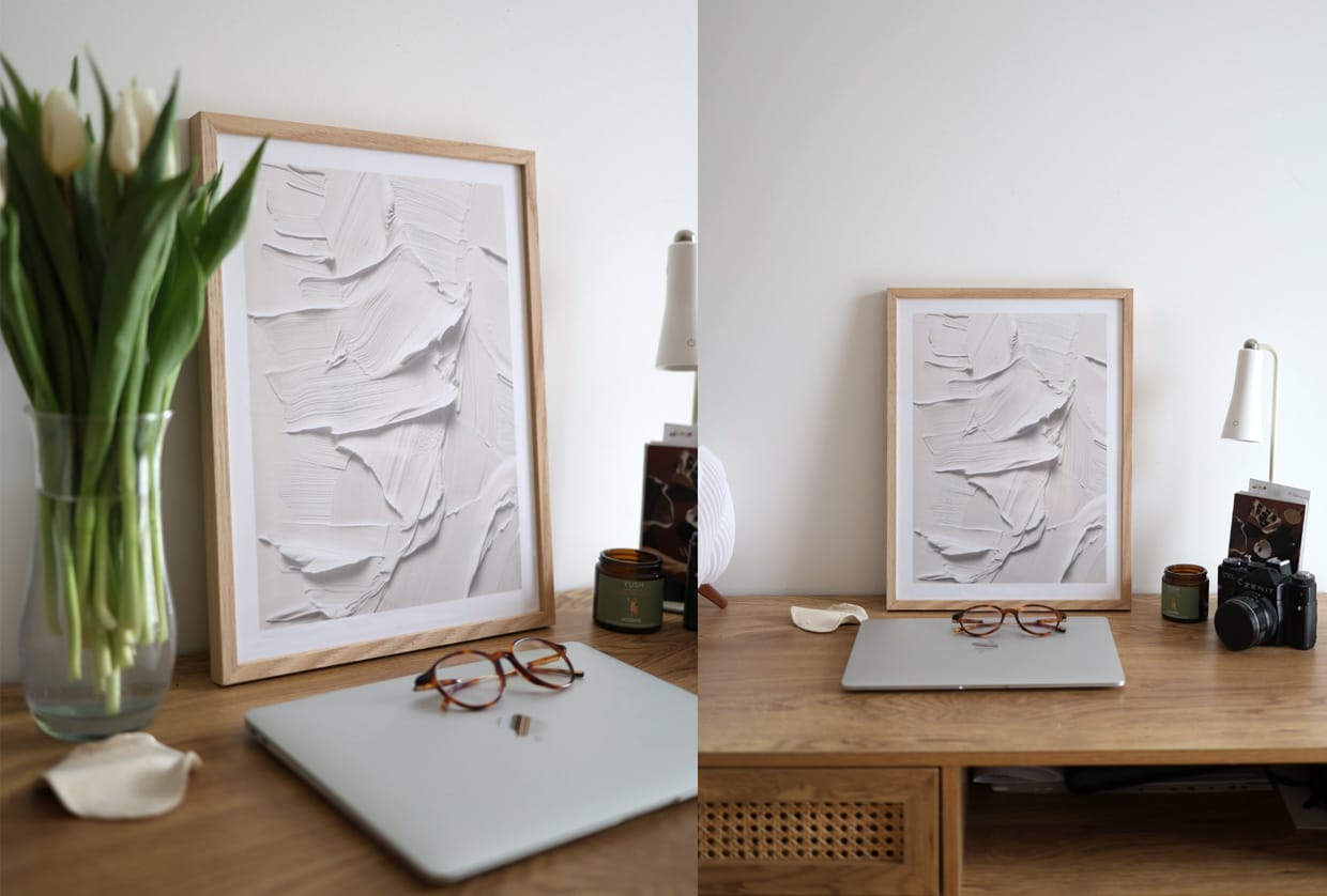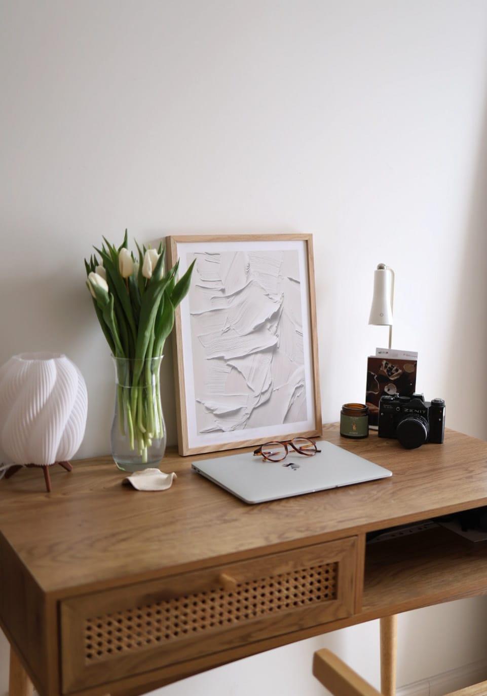 Do mojego biura zdecydowałam się na abstrakcyjne printy w neutralnych kolorach, które przy okazji stanowią bardzo fajne tło do moich modowych i lifestylowych zdjęć. Drewniane, delikatne ramki także pochodzą z tego sklepu.